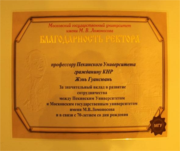 Получив благодарственную грамоту от Садовничего, я произнёс короткую благодарственную речь, поблагодарив Московский государственный университет за оказанную мне честь. Верю, что эта честь оказана не мне лично, а нашему Пекинскому университету, поэтому буду и дальше вносить свой скромный вклад в укрепление сотрудничества и дружбы между двумя вузами.