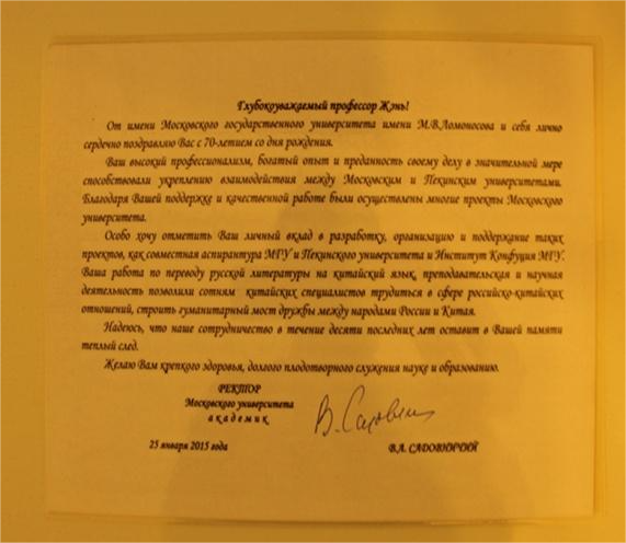 25 января 2015 года преподаватели и студенты Московского государственного университета собрались в зале новой библиотеки, чтобы отметить 260-летие университета. Торжество провёл сам ректор Виктор Садовничий. Ему почти 80 лет, но он полон энергии и остроумия, громогласен и обладает чувством юмора, демонстрируя мудрость, логику, энергию и стиль выдающегося русского математика. В тот день на праздновании был один эпизод: ректор МГУ Садовничий лично вручил мне благодарственную грамоту в знак признания моей шестилетней работы в МГУ и произнёс импровизированную речь, представив меня преподавателям и студентам МГУ, присутствовавшим на торжестве, а также мою многолетнюю работу по укреплению обменов и сотрудничества между Пекинским университетом и МГУ. В заключении он с лёгкой долей юмора сказал: «Этот профессор Пекинского университета говорит по-русски лучше, чем русские. Если кто-то в этом сомневается, то мы попросим его выступить по-русски после вручения благодарственной грамоты!» Его остроумный язык вызывал смех у зрителей.