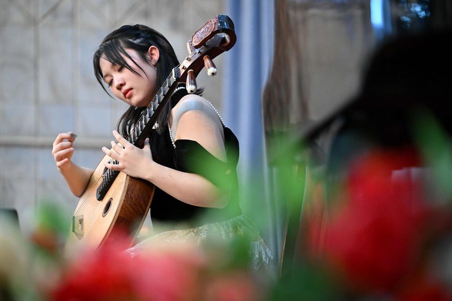 25 марта, Бишкек. Китаянка Шэнь Синьлэ играет на чжунжуане во время конкурса в номинации "народные инструменты" на Первых молодежных Дельфийских играх государств-членов ШОС. /Фото: Синьхуа/