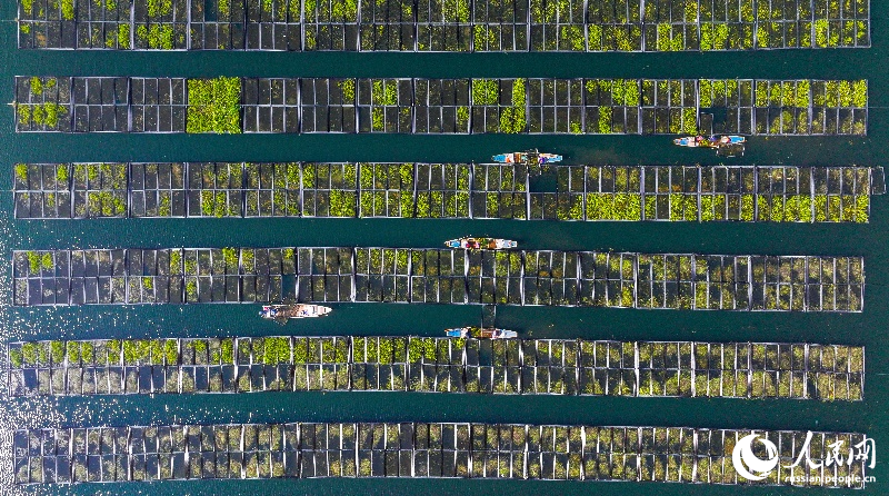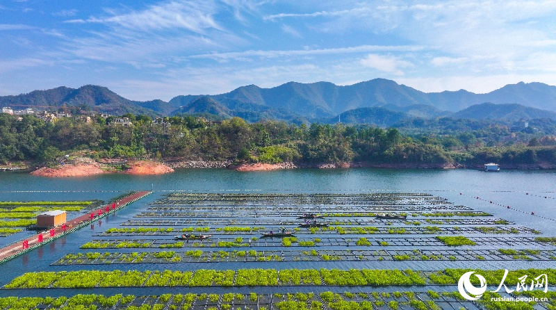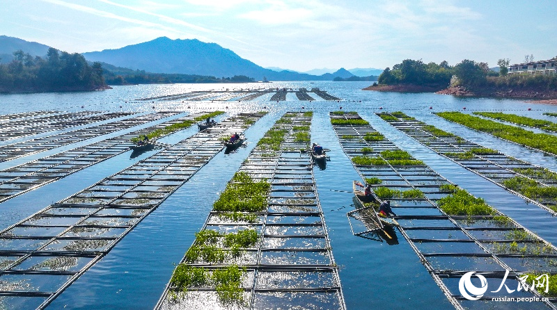 20 ноября, «Жэньминь жибао» онлайн -- На плавучих платформах площадью 1,4 га на озере Цяньдаоху в уезде Чуньань провинции Чжэцзян /Восточный Китай/ специалисты ухаживают за культурами и готовятся к посадке на зиму омежника яванского.