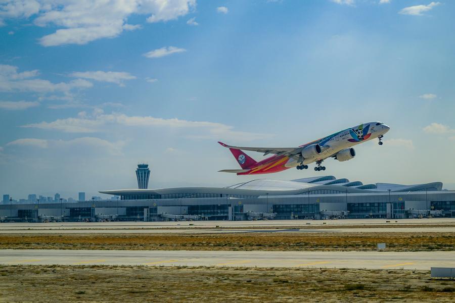 15 сентября 2025 года, самолет вылетает из международного аэропорта "Тяньшань" г. Урумчи /Синьцзян-Уйгурский АР, Северо-Западный Китай/. /Фото: Синьхуа/